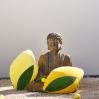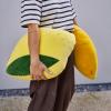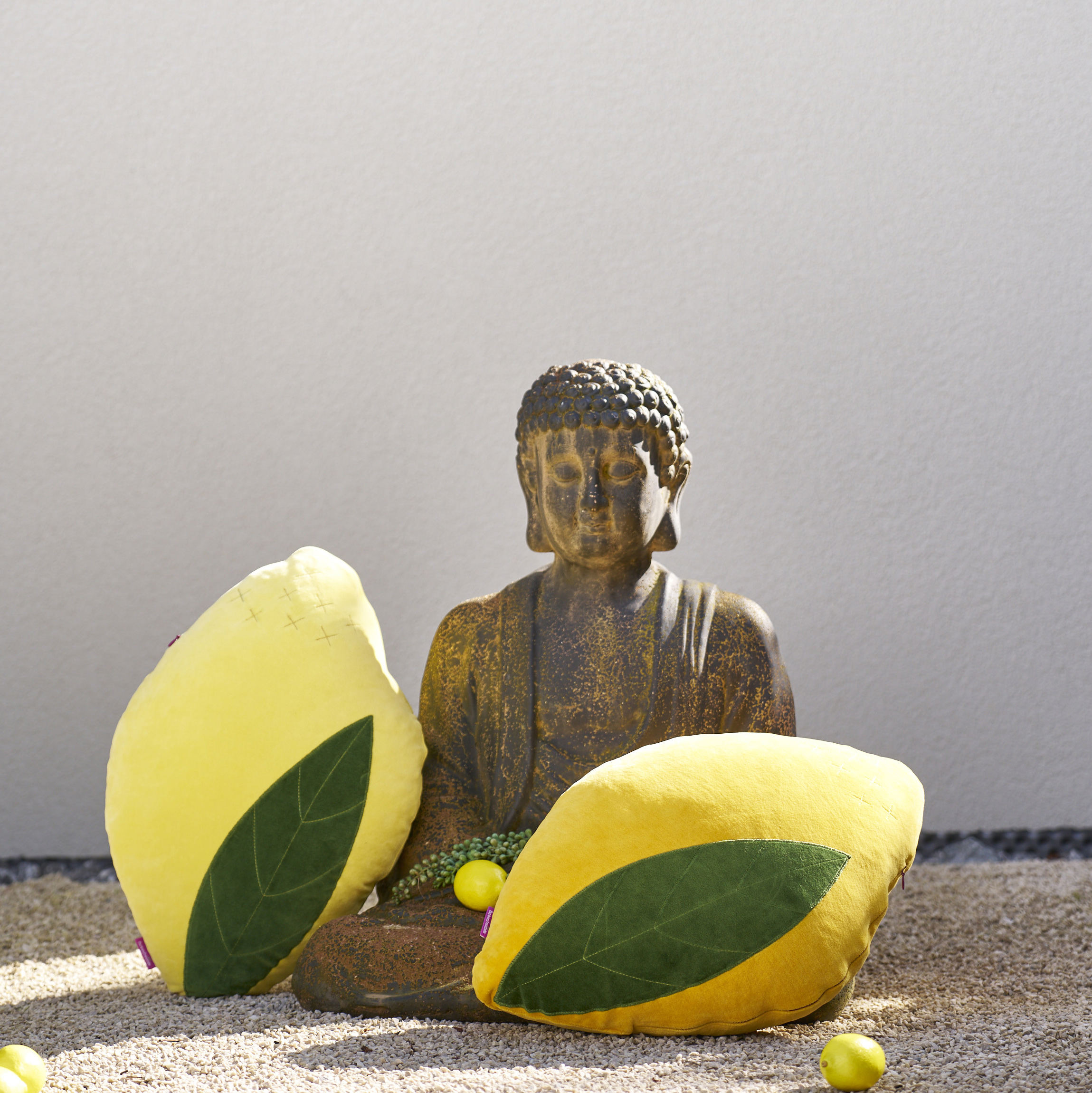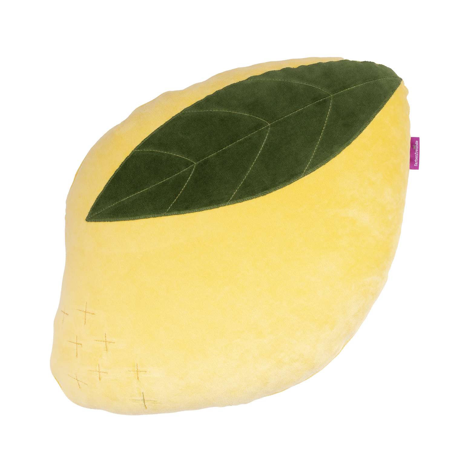Dieses Kissen in Form einer Zitrone huldigt dem Sommer.Das Blatt aus grünem Nicky wurde sehr aufwendig appliziert und dann nochmals bestickt.